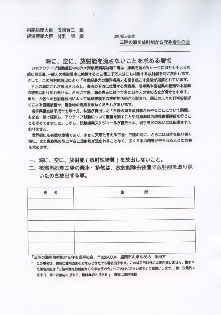 もう、書いて頂いた方はご存知かもしれませんが、青森県六ヶ所村の核燃料再処理工場に対し、海に、空に放射能を流さないことを求める署名です。